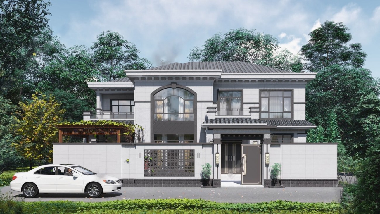 黄冈011 两层新中式(15.43x12.66米)-【易设计】